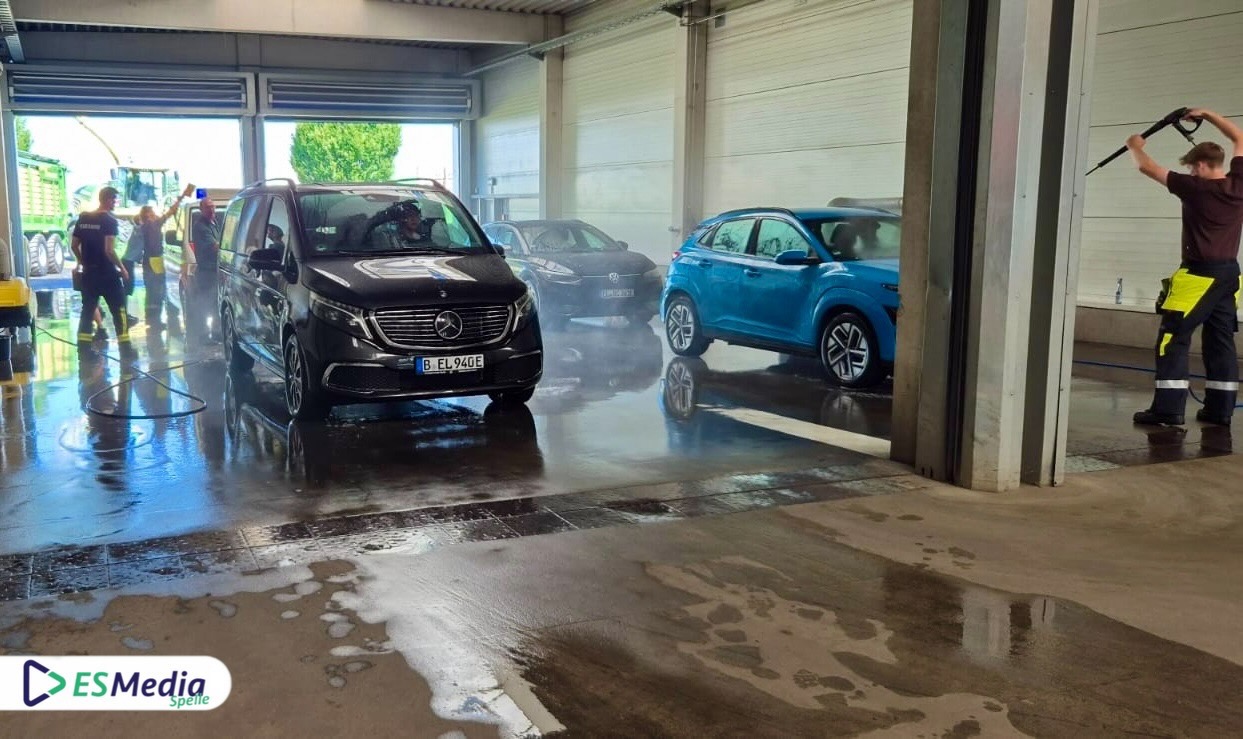 Spelle-Am heutigen Samstag herrschte  von 10:00 Uhr bis 15:00 Uhr reger Betrieb an der Verladehalle der Firma Bernard Krone – aber nicht etwa wegen neuer Maschinen oder Transporte. Nein, hier war die Jugendfeuerwehr Spelle mit vollem Einsatz: Es stand die große Autowaschaktion auf dem Programm, bei der die Fahrzeuge der Bürgerinnen und Bürger gegen eine Spende auf Hochglanz gebracht wurden.