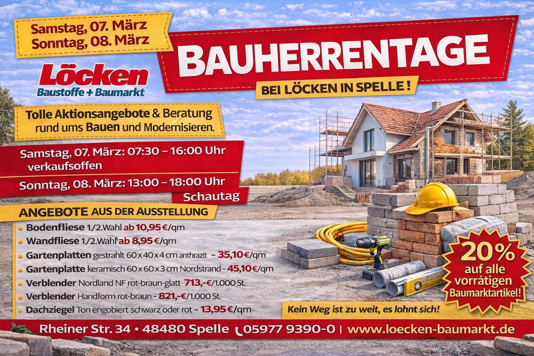 Spelle. Mit den ersten warmen Tagen beginnt die Bausaison – und passend dazu veranstaltet die Firma Löcken in Spelle am Samstag, den 07.03., von 07:30 bis 16:00 Uhr (verkaufsoffen) sowie am Sonntag, den 08.03., von 13:00 bis 17:00 Uhr (Schautag ohne Verkauf) ihre großen Bauherrentage.