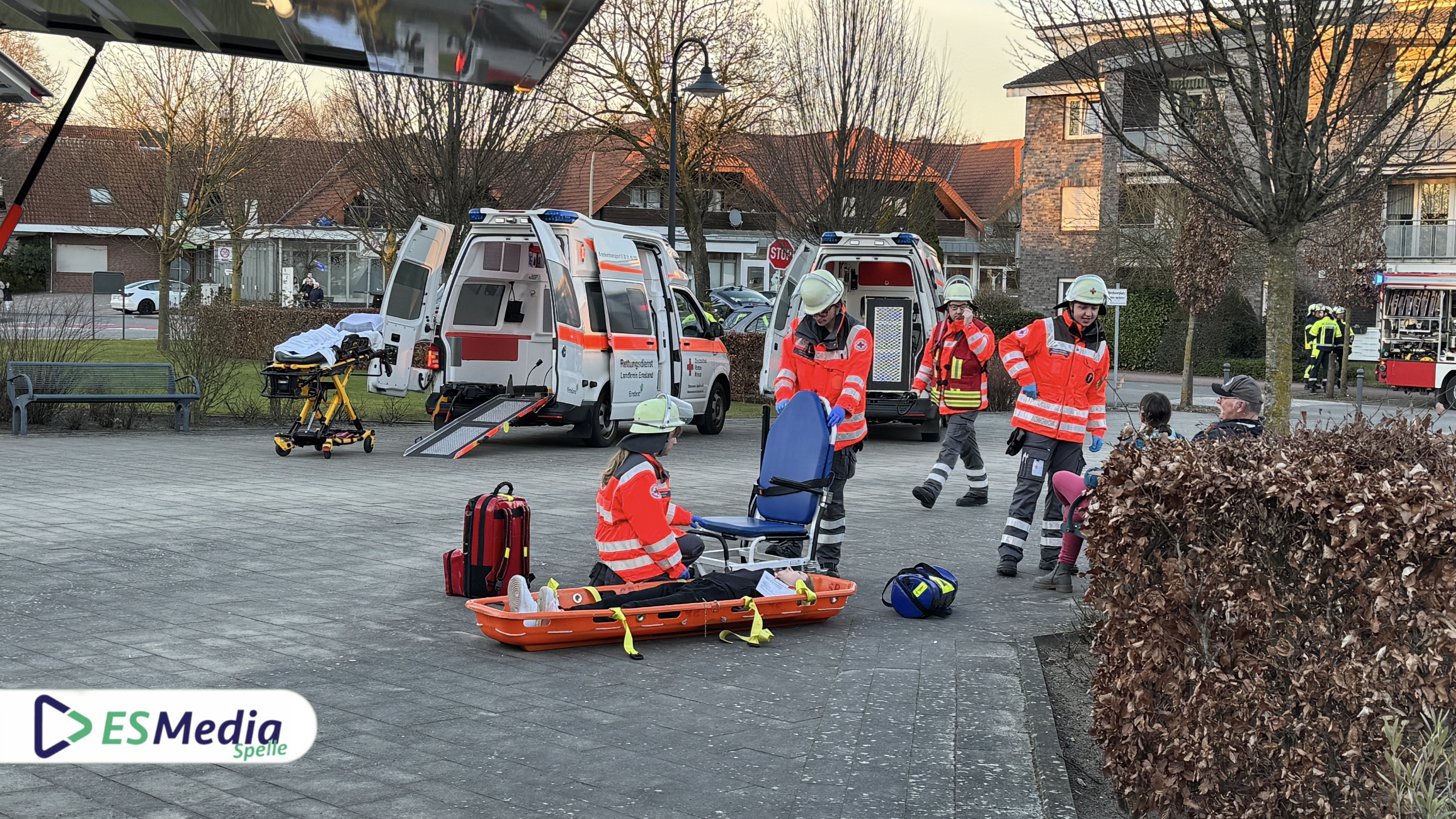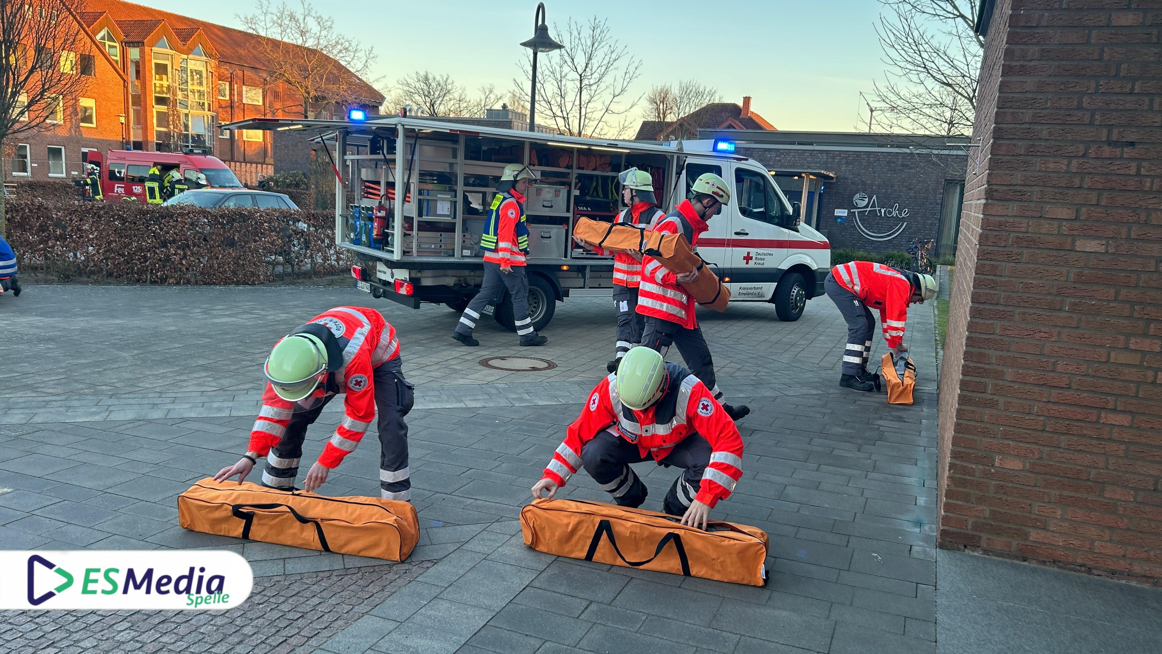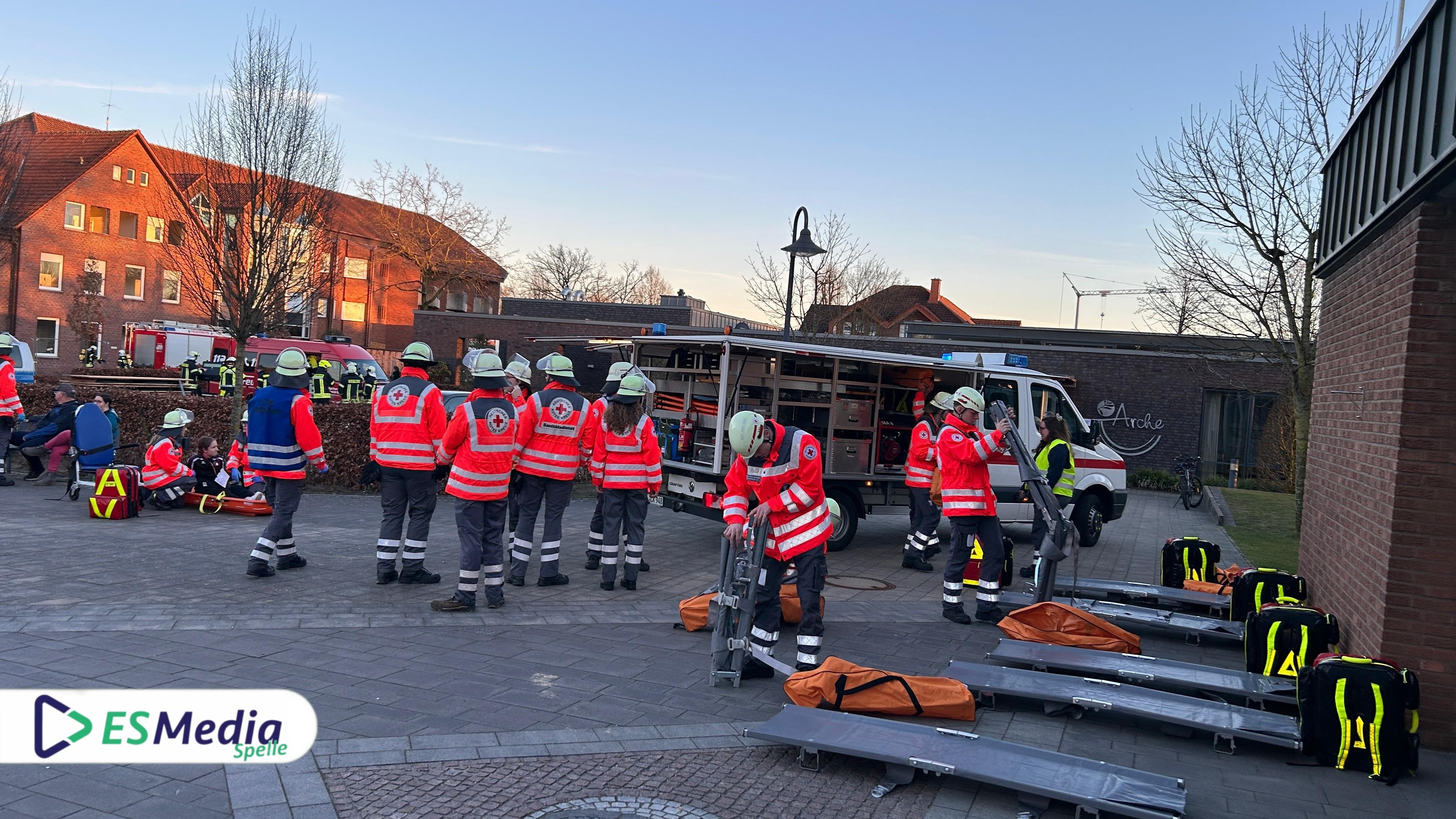 Spelle. Im Rahmen einer groß angelegten Samtgemeindeübung trainierten am Montagabend gegen 17:30 Uhr die Einsatzkräfte der Freiwilligen Feuerwehren Spelle, Venhaus, Lünne und Schapen gemeinsam mit dem Deutschen Roten Kreuz (DRK) Spelle ihre Einsatzabläufe und -taktiken unter nahezu realen Bedingungen.