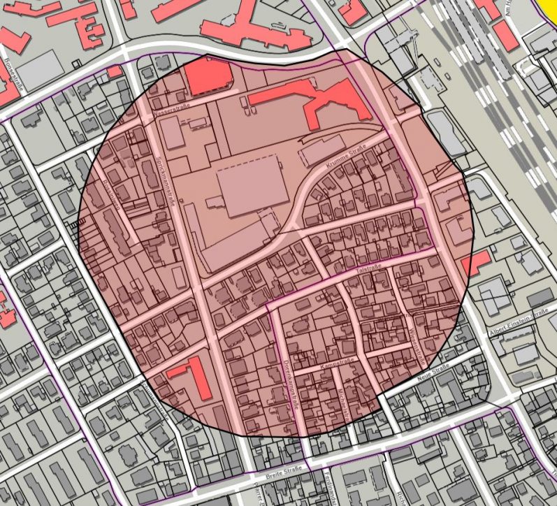 Sollte sich der Verdacht bestätigen, wären Evakuierungs- und Sperrmaßnahmen erforderlich. Derzeit wird vorsorglich mit einem Sicherheitsradius von rund 250 Metern um die Verdachtsstelle geplant. In diesem Fall müssten die umliegenden Gebäude kurzfristig geräumt und entsprechende Straßensperren eingerichtet werden. Eine Übersicht über den möglichen Evakuierungsbereich ist dem beigefügten Stadtplan zu entnehmen.